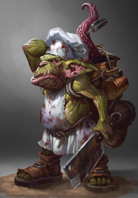 As the party examines the castle from a distance, a patrol of goblins led by the toothless Yeemik the Hobgoblin comes by. The party hides behind the debris as they pass and continue to the west side of the castle. Figuring it best not to barge through the front door of an obviously occupied castle, they go around to the east and discover a locked side entrance unguarded. Ender quickly picks the lock, and then they enter into a dimly lit hall with two doors: one wood with the sounds of pots and pans and goblins arguing, and another boarded up from the outside where they can hear the cooing growl of some sort of beast. As they decide what to do, the door to the banquet hall opens suddenly and a goblin wearing a pot for a helmet comes out. He demands: “You no here for soup? Where are my onions?” Mistaking the party for the merchants bringing supplies. They lure him out and then quickly push him into the darkened tower where the owlbear resides. They hear screaming inside, then silence.